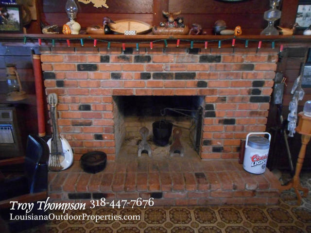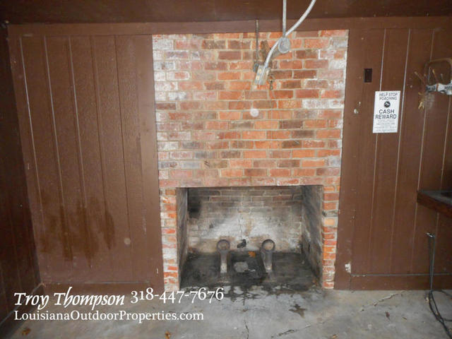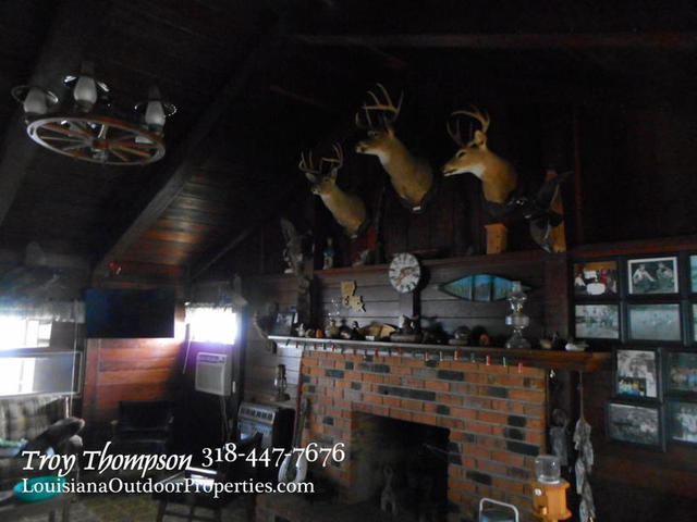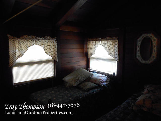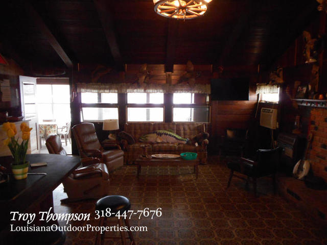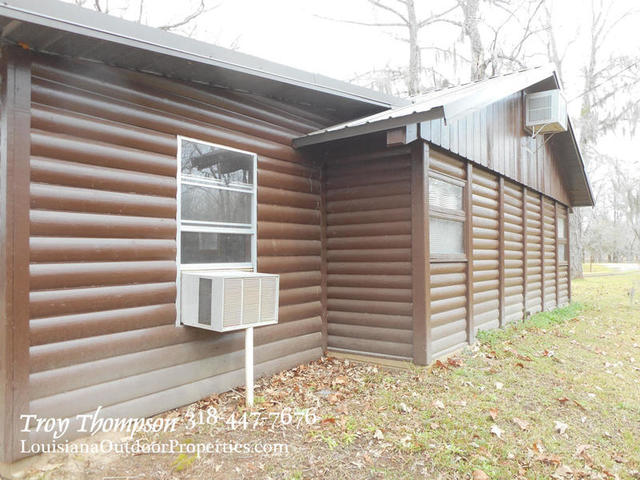 The log cabin camp is on a concrete slab and a cathedral ceiling with exposed beams. There are two bedrooms and one bathroom in the cabin. The fireplace is large and has a pot hook built in to allow you to cook over the fire. A propane heater is in place for additional heating and several window A/C units provide cooling. The front room is a sunroom with plenty of windows that can also be opened to let the breeze in. The total heated square footage is approx. 1046 sqft. There is also a 200 sqft porch with a covered entrance to the camp. The roof is a metal roof approx. 5 yrs old. and the treatment plant is in place and in good working order. City water is in place along with electricity and landline phone service. Cable TV and internet is available.