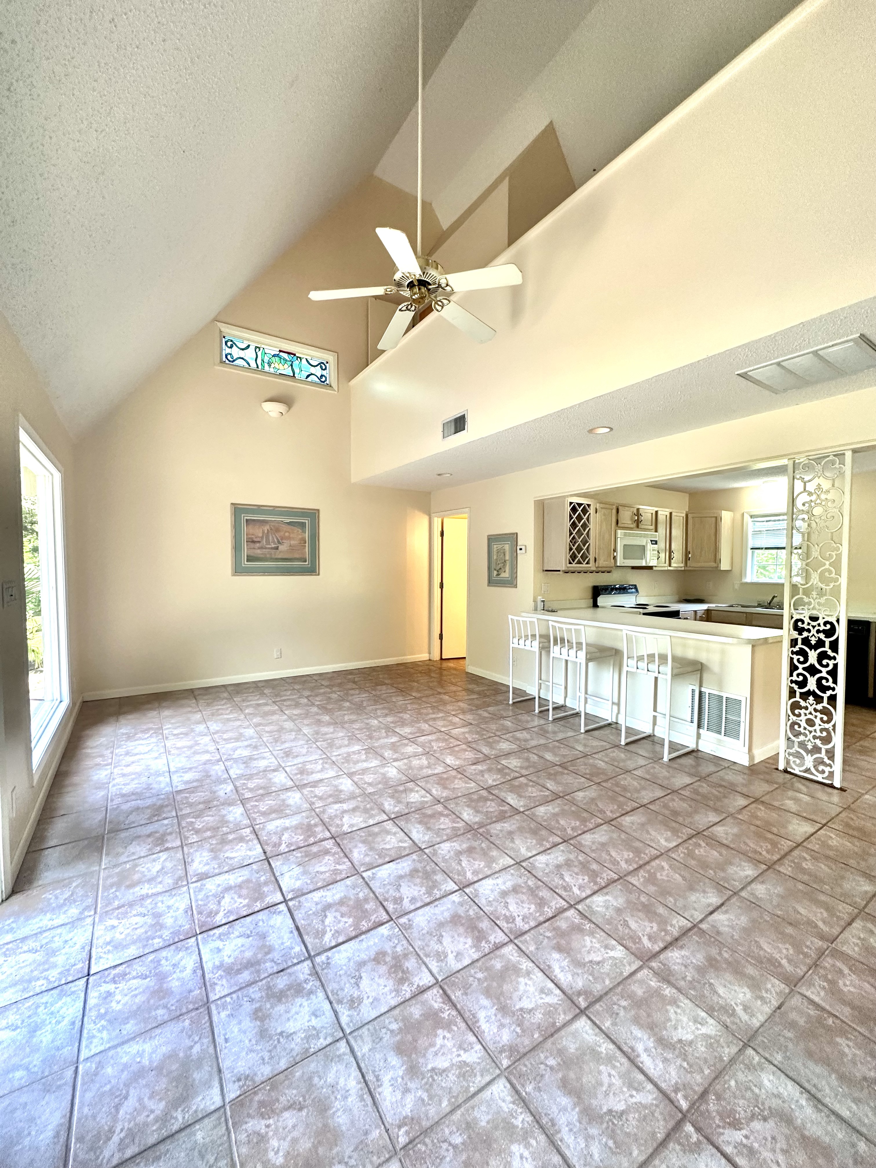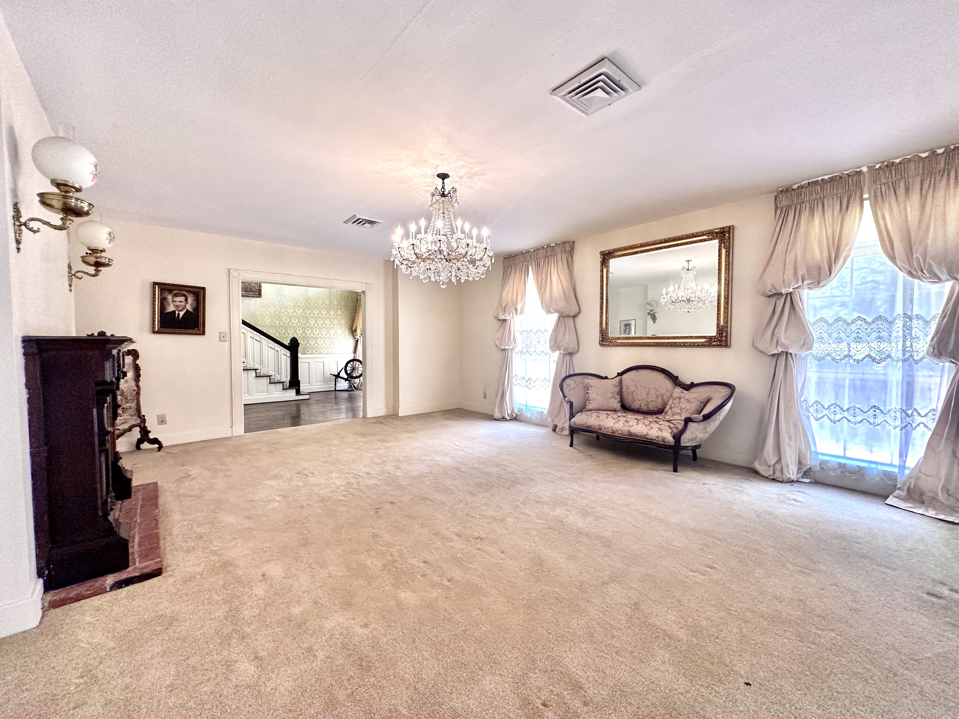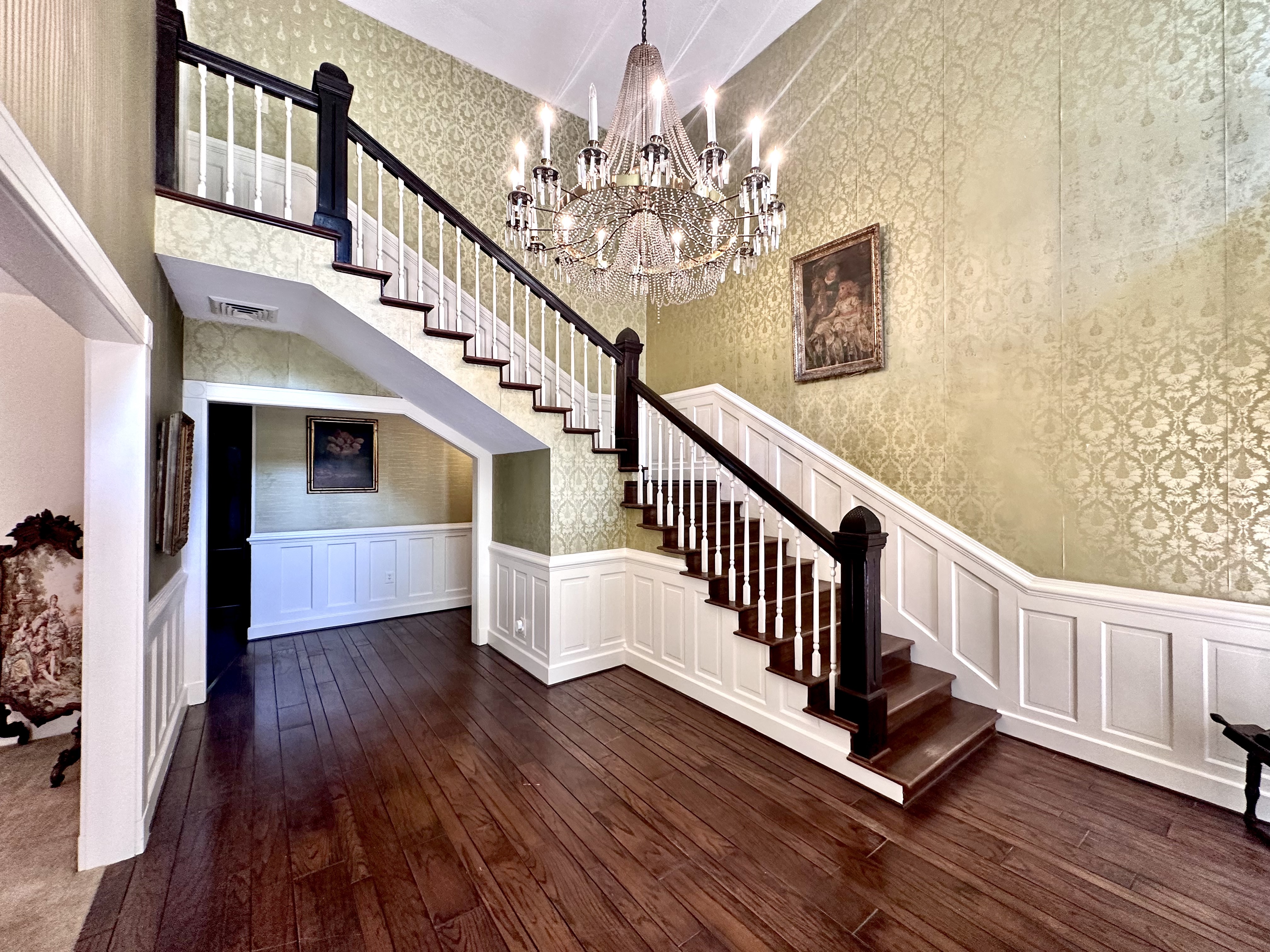Step through the front door into a grand foyer featuring a sweeping staircase and a stunning antique chandelier. From there, flow into a variety of living spaces, including a warm and inviting family room accented with pecky cypress, a formal living room, formal dining room, and a sunny breakfast area. Throughout the home, antique chandeliers and stained glass details add elegance and distinctive charm.