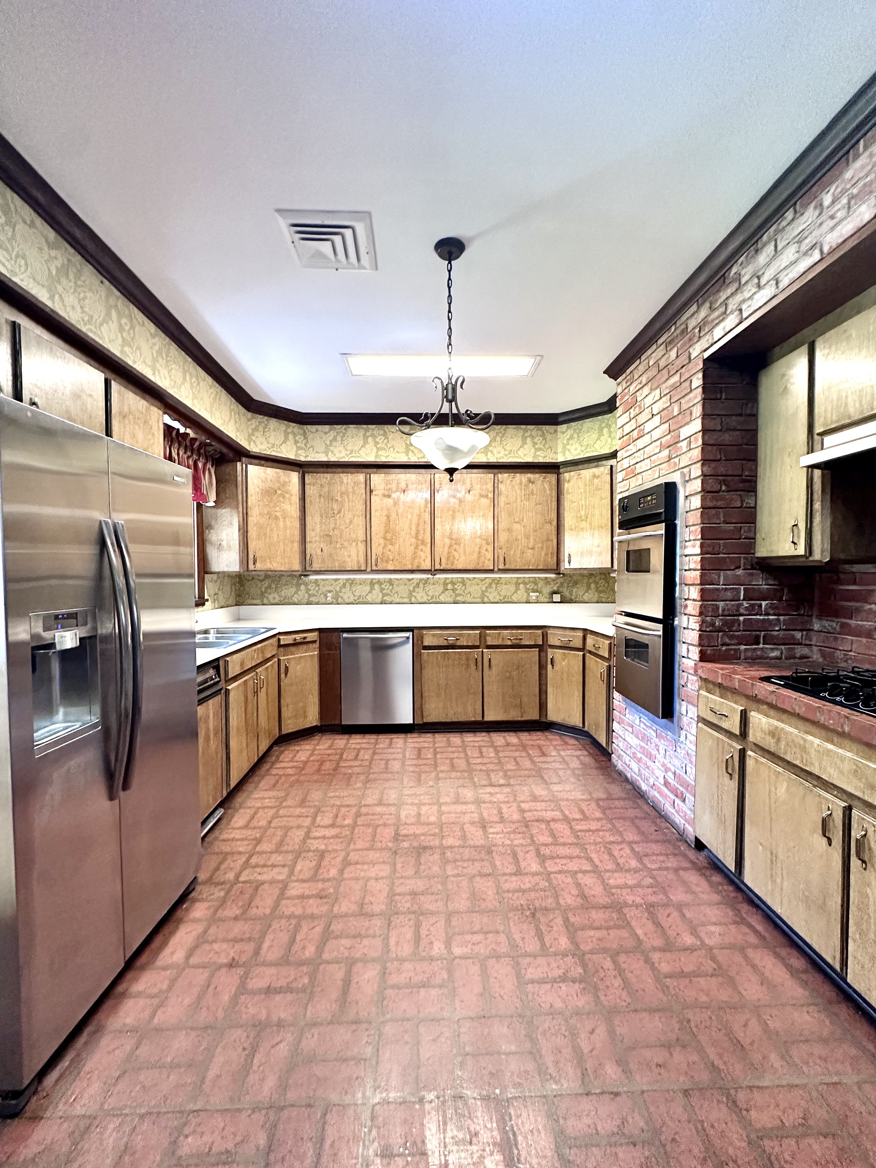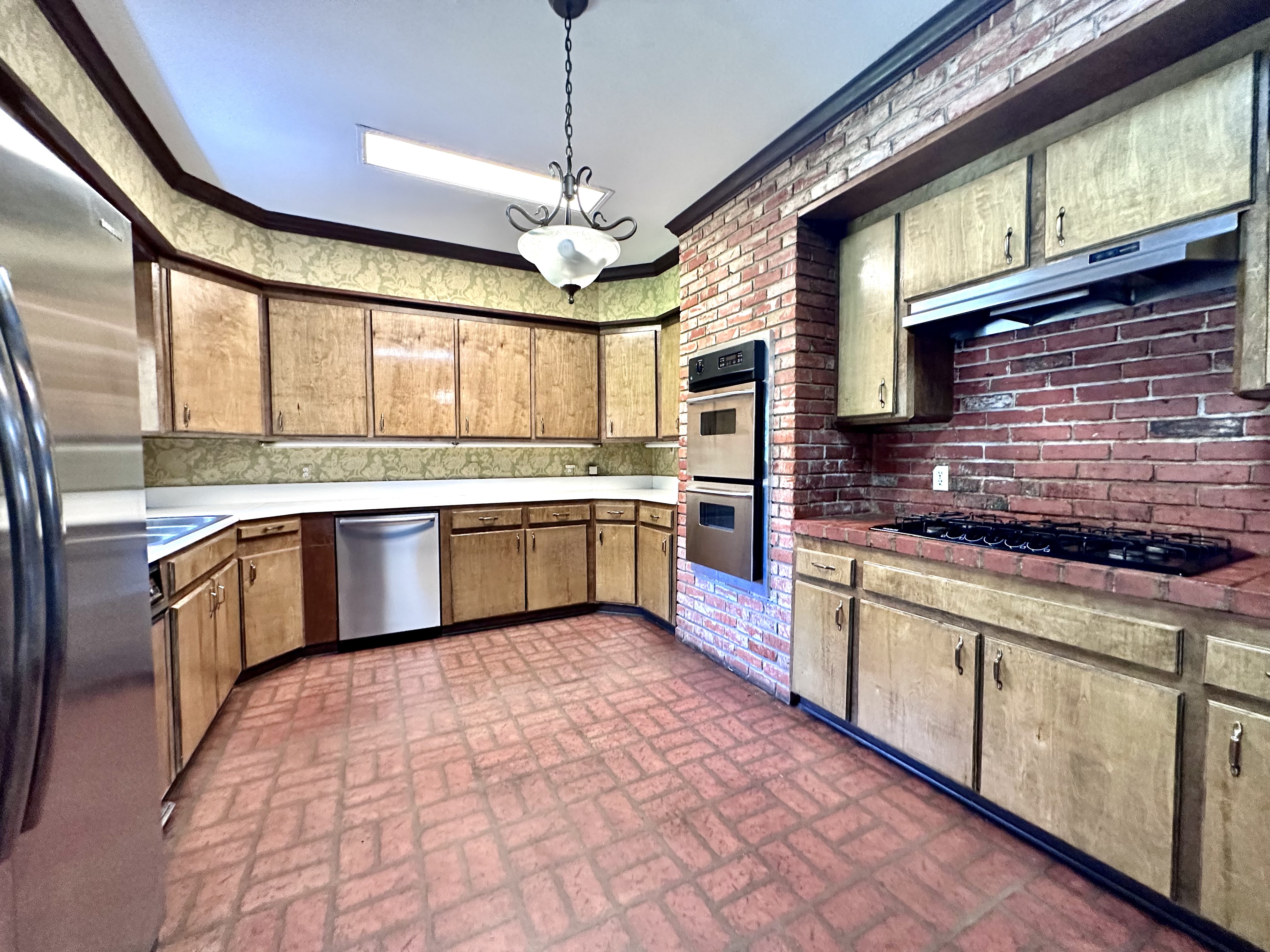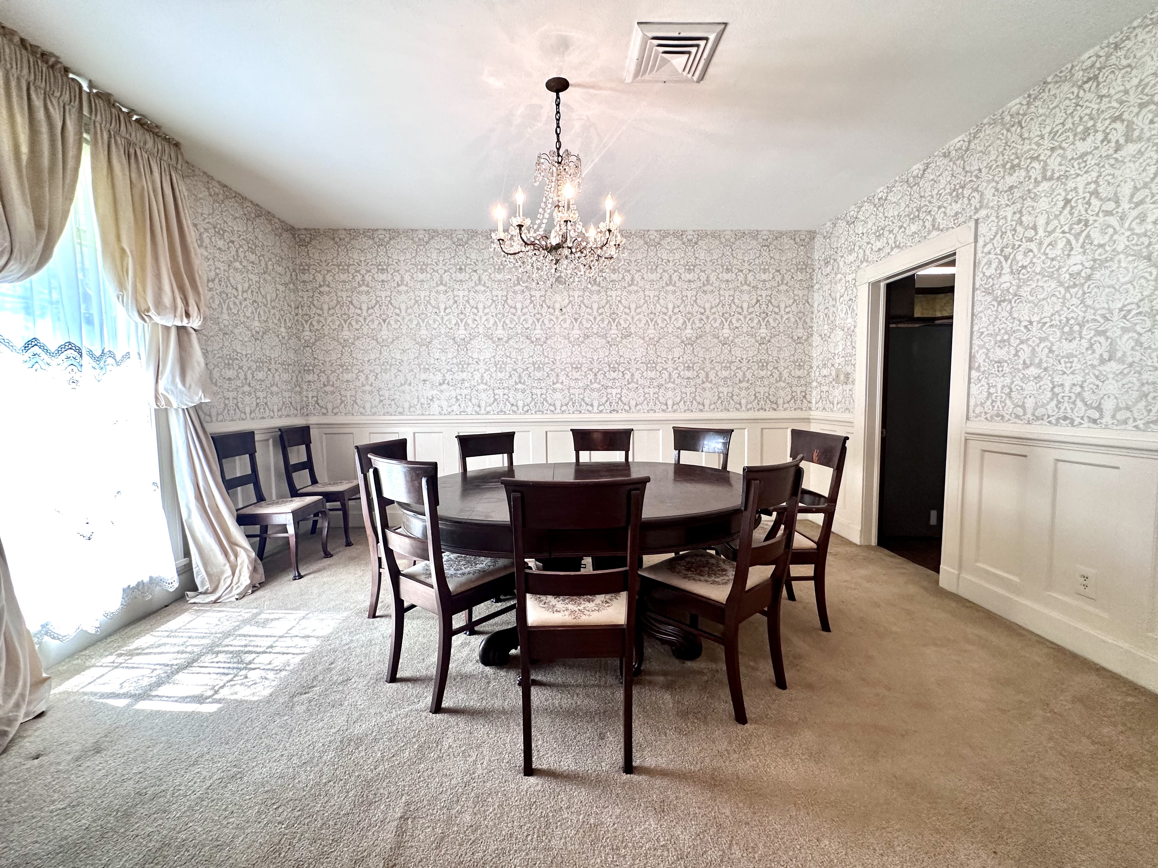 The kitchen features updated appliances and easy access to both casual and formal dining areas. A large utility room—accessible from both inside and outside—adds functionality and convenience.