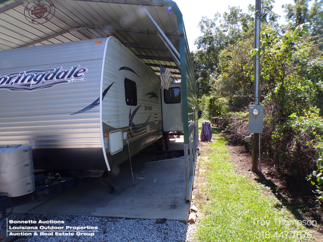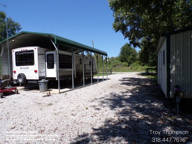 This turnkey, walk in ready, waterfront camp is located at 466 River Ln along Little River in the Spring Bayou Complex near Marksville. Everything is in place for you to start enjoying all your hunting, fishing and outdoor adventures! All you need to bring is your boat! From this lot you can access all of Spring Bayou by water as it has its own concrete boat ramp and boat slip leading into Little River. Spring Bayou WMA consists of over 12,000 Acres of public hunting and fishing opportunity and approx. 40% of it is water. This 0.50+/- Ac waterfront lot is owned and not leased so you don’t have to pay any yearly leases. Avoyelles Parish School Board property is also a short boat ride away for more public hunting opportunity. A 36’ x 8’, 2013 Keystone Springdale travel trailer with two slide outs is set up on a concrete slab with 30’ x 18’ metal canopy over the camper. Electricity, city water, and treatment plant is already in place. For storage, a 12’ x 20’ insulated metal shed is in place as is a fish cleaning station for those successful days on the water. A custom-made wood fired pizza oven is also included which the seller says is great for cooking turkeys, roasts, etc., besides making great pizzas. The large limestone parking area leads to the concrete boat launch, and all of this is behind a locked gate. For those with pets, fencing leads up to the water. For the sportsman, this camp truly is turnkey and walk in ready!